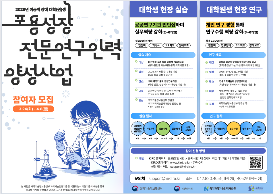 공지사항 PRINT 2026년 이공계 대학생 현장 연구지원 프로그램 참여 신청 안내 2026.03.25 조회수 52 장애학생지원센터 share facebook twitter kakaotalk 카카오톡 앱이설치된 모바일 기기에서만공유 가능합니다. https://www.syu.ac.kr/sscd/2026/03/25/2026%eb%85%84-%ec%9d%b4%ea%b3%b5%ea%b3%84-%eb%8c%80%ed%95%99%ec%83%9d-%ed%98%84%ec%9e%a5-%ec%97%b0%ea%b5%ac%ec%a7%80%ec%9b%90-%ed%94%84%eb%a1%9c%ea%b7%b8%eb%9e%a8-%ec%b0%b8%ec%97%ac-%ec%8b%a0%ec%b2%ad/ 복사 Post Views: 52 붙임1.-2026년-이공계-장애-대학생-현장-연구지원-참여-신청요강.hwp (93.0 KB) 붙임2.-2026년-이공계-장애-대학생-현장-연구지원-모집-홍보물.pdf (1.0 MB) facebook twitter kakaotalk 카카오톡 앱이설치된 모바일 기기에서만공유 가능합니다. 이전글 글이 없습니다. 다음글 장애인 기업체 채용안내(2026년 3월 2차) 목록 장애학생들의 빛나는 학창 생활과 함께 합니다 장애학생지원센터