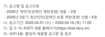 공지사항 PRINT 한국과학기술정보연구원 장애인 제한경쟁 채용 안내 2026.04.03 조회수 27 장애학생지원센터 share facebook twitter kakaotalk 카카오톡 앱이설치된 모바일 기기에서만공유 가능합니다. https://www.syu.ac.kr/sscd/2026/04/03/%ed%95%9c%ea%b5%ad%ea%b3%bc%ed%95%99%ea%b8%b0%ec%88%a0%ec%a0%95%eb%b3%b4%ec%97%b0%ea%b5%ac%ec%9b%90-%ec%9e%a5%ec%95%a0%ec%9d%b8-%ec%a0%9c%ed%95%9c%ea%b2%bd%ec%9f%81-%ec%b1%84%ec%9a%a9-%ec%95%88/ 복사 Post Views: 27 1.-2026년-계약직장애인-제한경쟁-채용-공고문-등.zip (314.3 KB) 2.-2026년-2분기-청년인턴장애인-보훈제한경쟁-선발-공고문-등.zip (240.1 KB) facebook twitter kakaotalk 카카오톡 앱이설치된 모바일 기기에서만공유 가능합니다. 이전글 장애인 기업체 채용안내(2026년 4월 1차) 다음글 2026년 한국전기안전공사 체험형인턴(장애인)채용공고 목록 장애학생들의 빛나는 학창 생활과 함께 합니다 장애학생지원센터