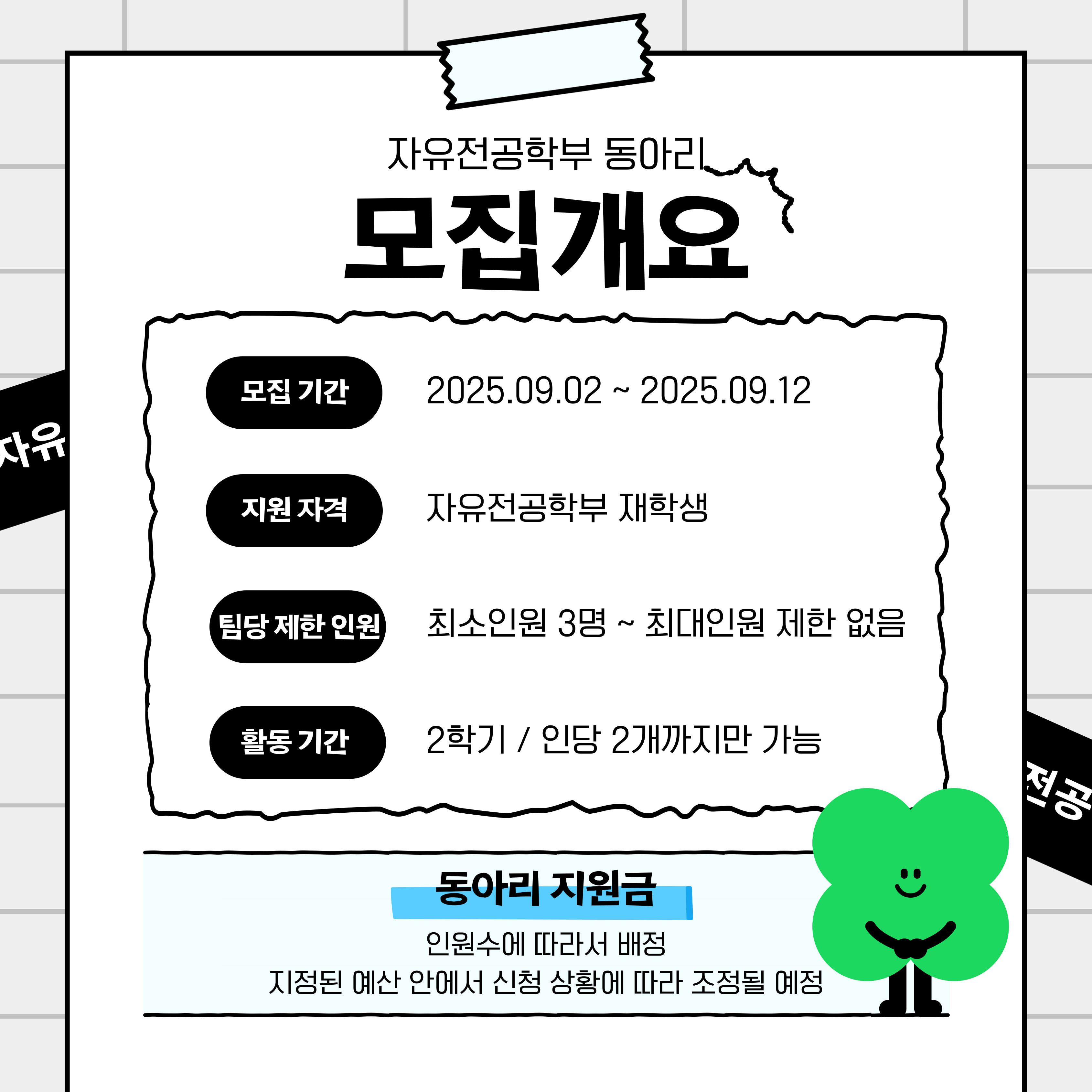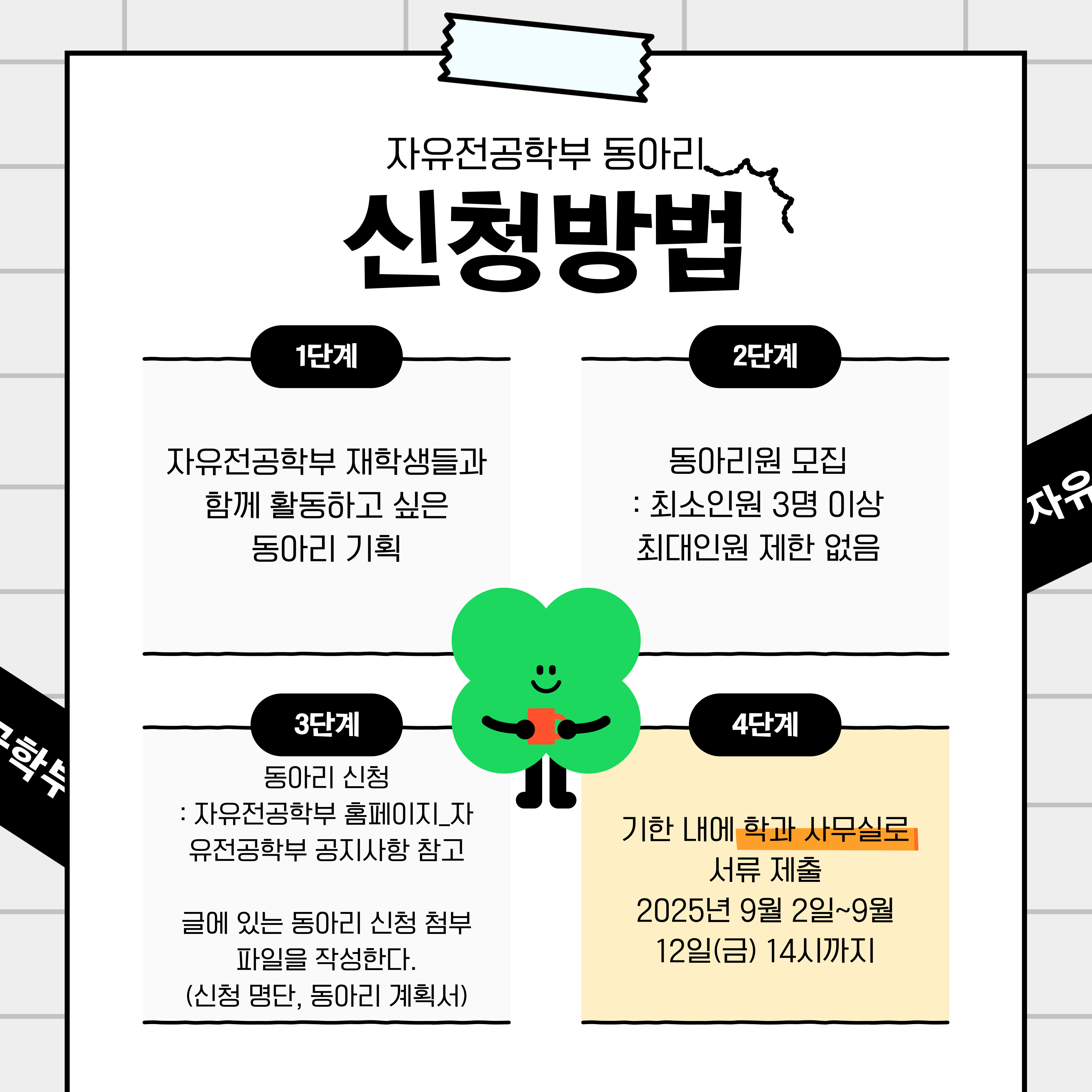 [2025]자유전공학부 2학기 동아리 신청 2025.09.02 조회수 172 자유전공학부 SNS Share FACEBOOK X KAKAO https://www.syu.ac.kr/supreme/community/notice/2241-2/ 복사 Prev [2025]자유전공학부 29초 영화제 참여자 모집 (팀) Next [안내] 2026학년도 입시자 대상 자유전공학부 교육과정 기준 안내 목록보기