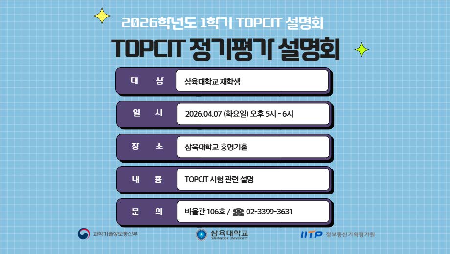 공지사항 PRINT 2026학년도 TOPCIT 정기평가 설명회 2026.03.30 조회수 197 SW중심대학사업단 share facebook twitter kakaotalk 카카오톡 앱이설치된 모바일 기기에서만공유 가능합니다. https://www.syu.ac.kr/swuniv/2026/03/30/2026%ed%95%99%eb%85%84%eb%8f%84-topcit-%ec%a0%95%ea%b8%b0%ed%8f%89%ea%b0%80-%ec%84%a4%eb%aa%85%ed%9a%8c-2/ 복사 2026학년도 TOPCIT 정기평가 설명회 일시: 2026년 4월 7일(화), 17:00~ 18:00 장소: 삼육대학교 홍명기홀 대상: 삼육대학교 재학생 (전공 불문) Post Views: 197 facebook twitter kakaotalk 카카오톡 앱이설치된 모바일 기기에서만공유 가능합니다. 이전글 글이 없습니다. 다음글 SW역량검정(TOPCIT) 제25회 정기평가 시행 안내 목록 담당부서 소프트웨어 중심대학 전화번호 02-3399-3633 이메일 swuniv@syu.ac.kr 최종수정일 : 2026년 03월 30일