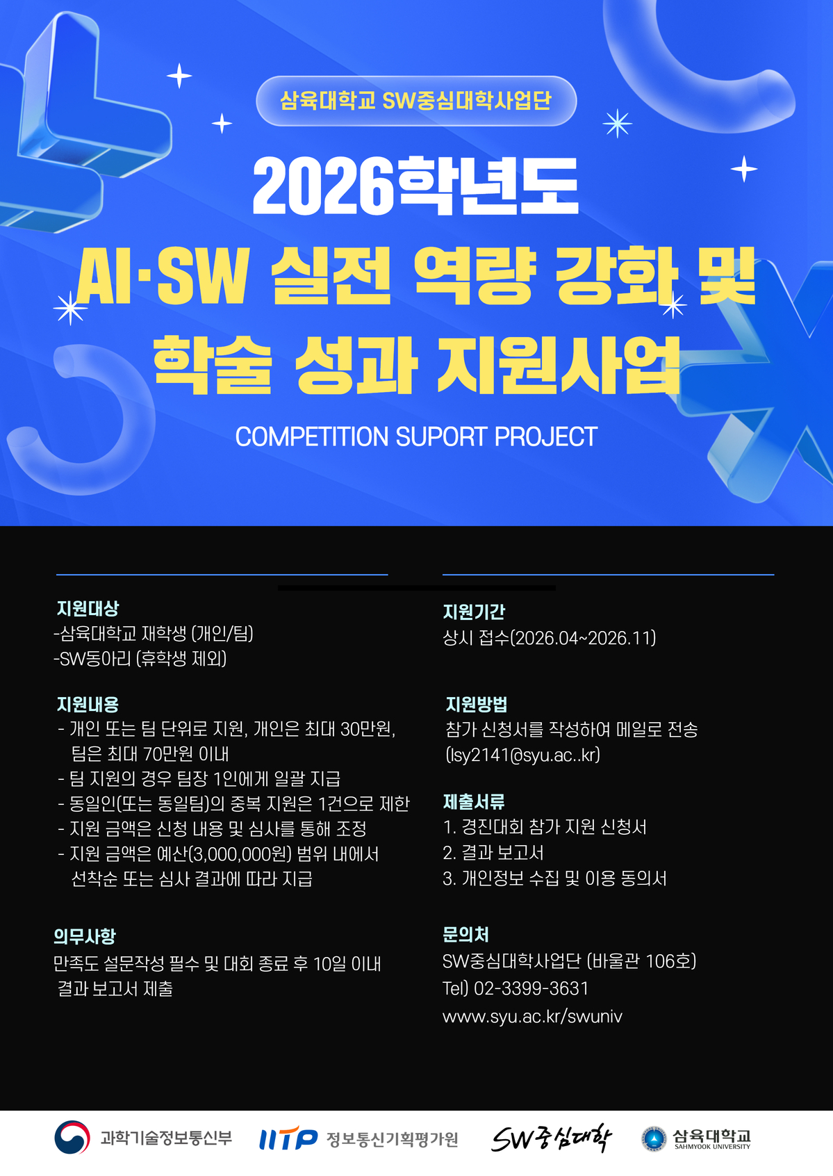 공지사항 PRINT 2026학년도 AI·SW 실전 역량 강화 및 학술 성과 지원 사업 2026.04.10 조회수 104 SW중심대학사업단 share facebook twitter kakaotalk 카카오톡 앱이설치된 모바일 기기에서만공유 가능합니다. https://www.syu.ac.kr/swuniv/2026/04/10/2026%ed%95%99%eb%85%84%eb%8f%84-ai%c2%b7sw-%ec%8b%a4%ec%a0%84-%ec%97%ad%eb%9f%89-%ea%b0%95%ed%99%94-%eb%b0%8f-%ed%95%99%ec%88%a0-%ec%84%b1%ea%b3%bc-%ec%a7%80%ec%9b%90-%ec%82%ac%ec%97%85/ 복사 사업 내용 : AI·SW 실전 역량 강화 및 학술 성과 지원 사업 지원 대상 : 삼육대학교 재학생 개인 또는 팀, SW동아리(휴학생 제외) 지원 내용 : – 개인 또는 팀 단위로 지원, 개인은 최대 30만원, 팀은 최대 70만원 이내 – 팀 지원의 경우 팀장 1인에게 일괄 지급 – 동일인(또는 동일팀)의 중복 지원은 1건으로 제한 – 지원 금액은 신청 내용 및 심사를 통해 조정 – 지원 금액은 예산(3,000,000원) 범위 내에서 선착순 또는 심사 결과에 따라 지급 지원 기간 : 상시 접수(26.04 ~ 26.11) 지원 방법 : 참가 신청서를 작성하여 메일로 전송 (lsy2141@syu.ac.kr) 제출 서류 * 경진대회 참가 지원 신청서 * 결과보고서 * 개인정보 수집 및 이용 동의서 활동 의무사항 * 만족도 설문작성은 필수! *대회 종료 후 10일 이내 결과보고서 제출 문의 : 바울관 106호 Tel) 02.3399.3631 Post Views: 104 붙임1_-AISW-실전-역량-강화-및-학술-성과-지원-사업-양식학생배포용.hwp (85.0 KB) facebook twitter kakaotalk 카카오톡 앱이설치된 모바일 기기에서만공유 가능합니다. 이전글 글이 없습니다. 다음글 2026-1 오픈소스 SW교육 특강 안내 목록 담당부서 소프트웨어 중심대학 전화번호 02-3399-3633 이메일 swuniv@syu.ac.kr 최종수정일 : 2026년 04월 13일