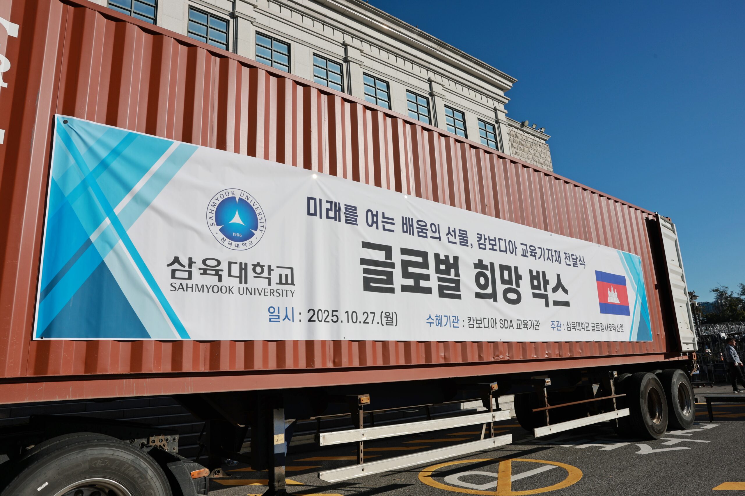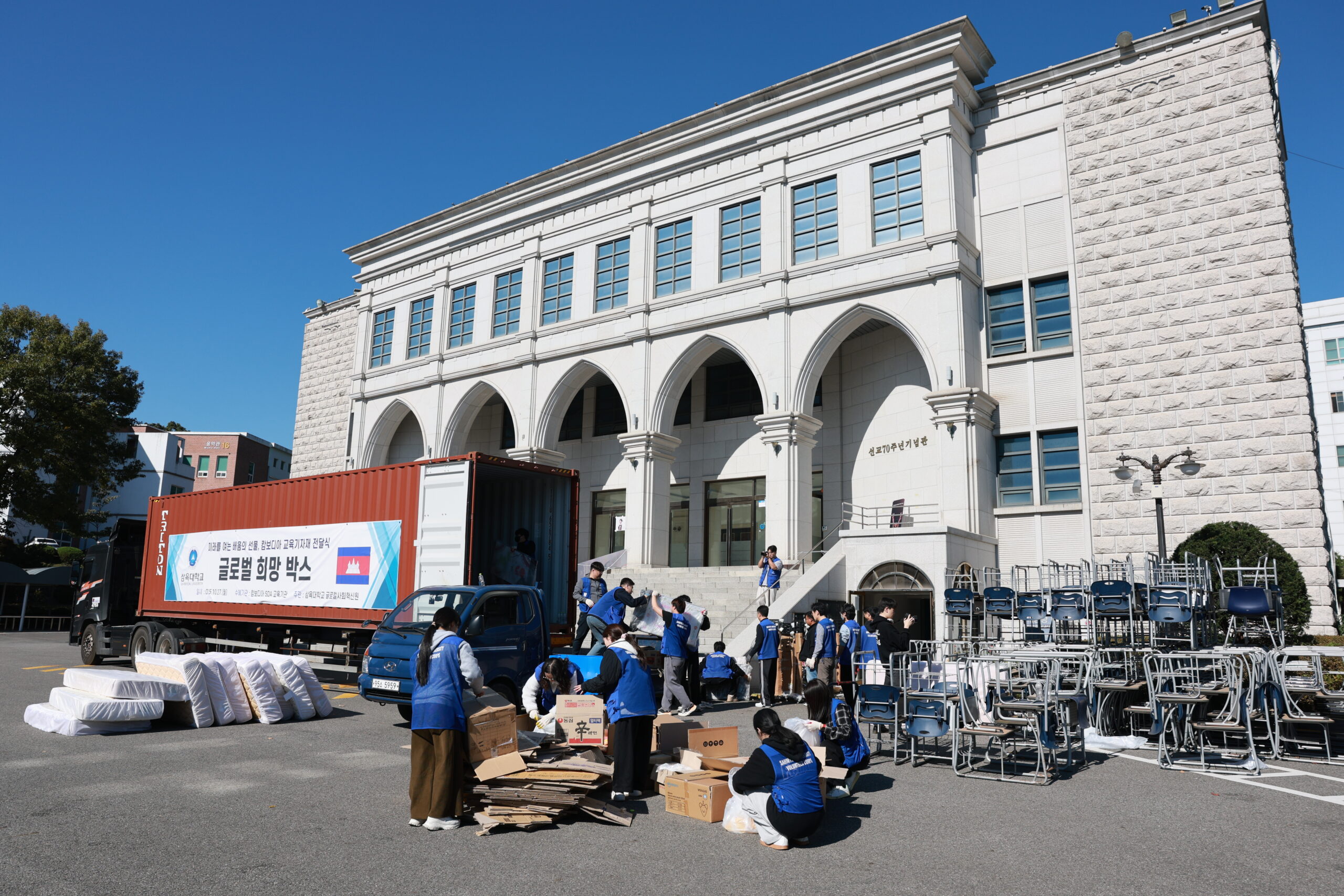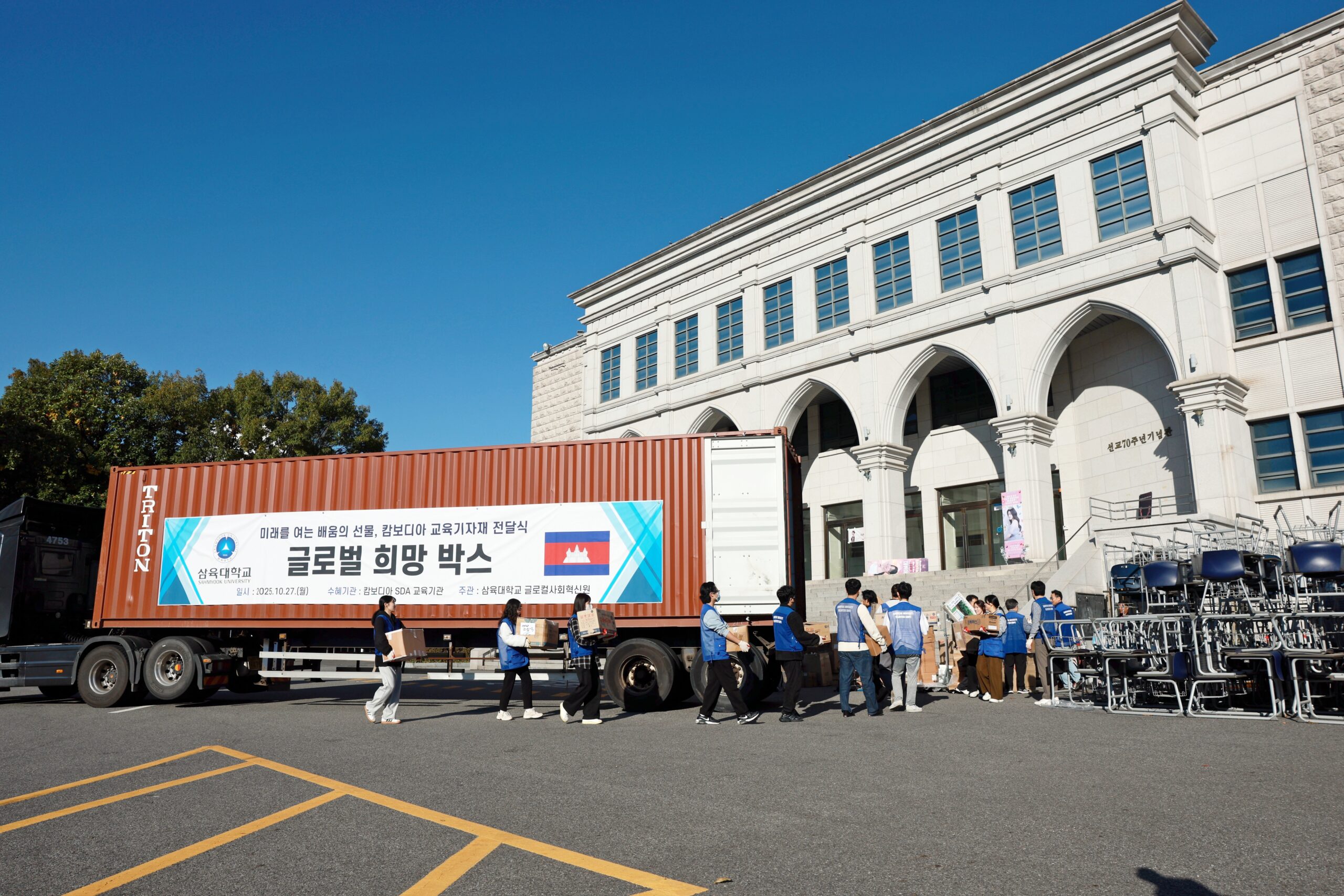 삼육대는 27일 오전 교내 대강당(선교70주년기념관) 앞에서 캄보디아에 후원 물품을 보내는 ‘글로벌 희망 박스(Global Hope Container)’ 선적 행사를 개최했다.
