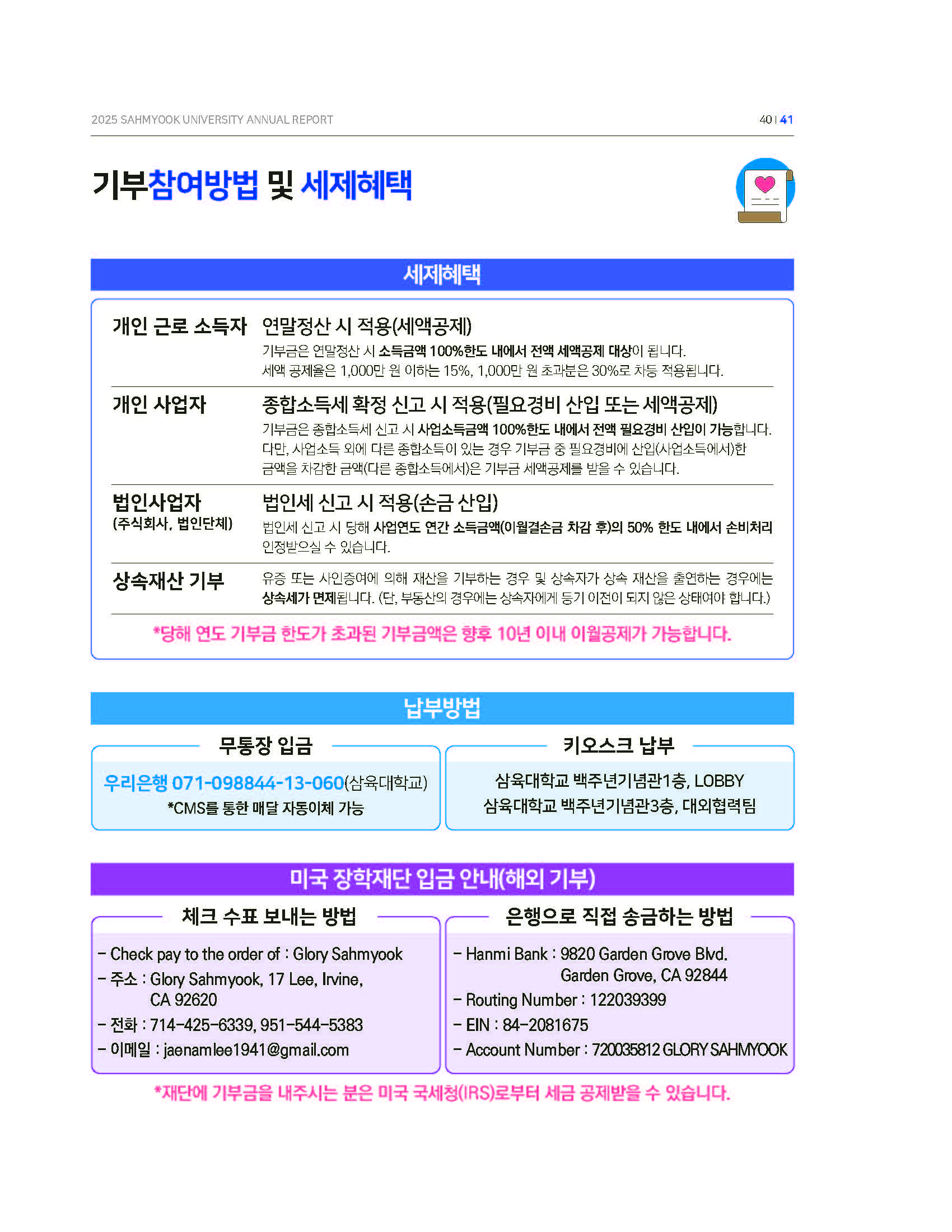 삼육대학교_25연차보고서(웹용)_페이지_41 PRINT 삼육대학교_25연차보고서(웹용)_페이지_41 2026.04.14 조회수 0 대외협력팀 share facebook twitter kakaotalk 카카오톡 앱이설치된 모바일 기기에서만공유 가능합니다. https://www.syu.ac.kr/syufund/2025%ed%95%99%eb%85%84%eb%8f%84-%ec%97%b0%ec%b0%a8%eb%b3%b4%ea%b3%a0%ec%84%9c-%ec%b6%9c%ed%8c%90/%ec%82%bc%ec%9c%a1%eb%8c%80%ed%95%99%ea%b5%90_25%ec%97%b0%ec%b0%a8%eb%b3%b4%ea%b3%a0%ec%84%9c%ec%9b%b9%ec%9a%a9_%ed%8e%98%ec%9d%b4%ec%a7%80_41/ 복사 facebook twitter kakaotalk 카카오톡 앱이설치된 모바일 기기에서만공유 가능합니다. 이전글 글이 없습니다. 다음글 글이 없습니다. 목록 나누는 기쁨, 함께하는 영광 Glory 삼육