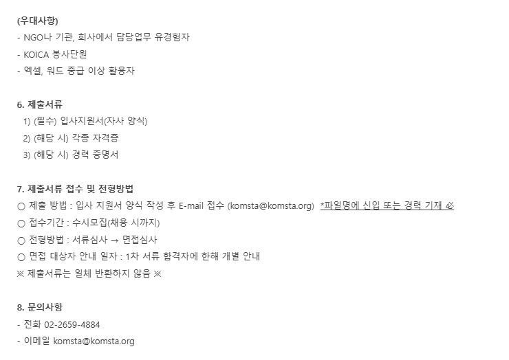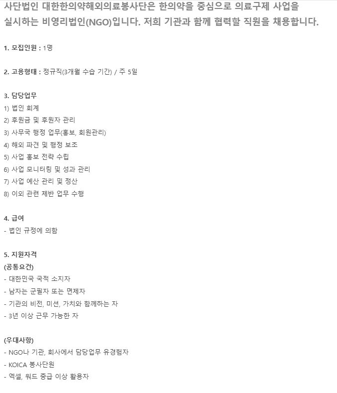 채용 PRINT [건강증진] 대한한의약해외의료봉사단 직원 채용 공고 2026.03.19 조회수 17 학과사무실 share facebook twitter kakaotalk 카카오톡 앱이설치된 모바일 기기에서만공유 가능합니다. https://www.syu.ac.kr/syuhealth/%ea%b1%b4%ea%b0%95%ec%a6%9d%ec%a7%84-%eb%8c%80%ed%95%9c%ed%95%9c%ec%9d%98%ec%95%bd%ed%95%b4%ec%99%b8%ec%9d%98%eb%a3%8c%eb%b4%89%ec%82%ac%eb%8b%a8-%ec%a7%81%ec%9b%90-%ec%b1%84%ec%9a%a9-%ea%b3%b5/ 복사 https://komsta.org/notice/?q=YToxOntzOjEyOiJrZXl3b3JkX3R5cGUiO3M6MzoiYWxsIjt9&bmode=view&idx=170431130&t=board facebook twitter kakaotalk 카카오톡 앱이설치된 모바일 기기에서만공유 가능합니다. 이전글 글이 없습니다. 다음글 [산업보건] 2026 상반기 현대건설 신입사원(안전품질) 채용 목록 담당부서 보건관리학과 사무실 전화번호 02-3399-1673 이메일 health@syu.ac.kr 최종수정일 : 2026.03.19