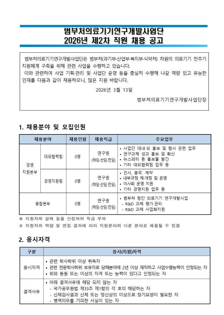 [건강증진] 범부처의료기기연구개발사업단 2026년 제2차 직원 채용 공고
