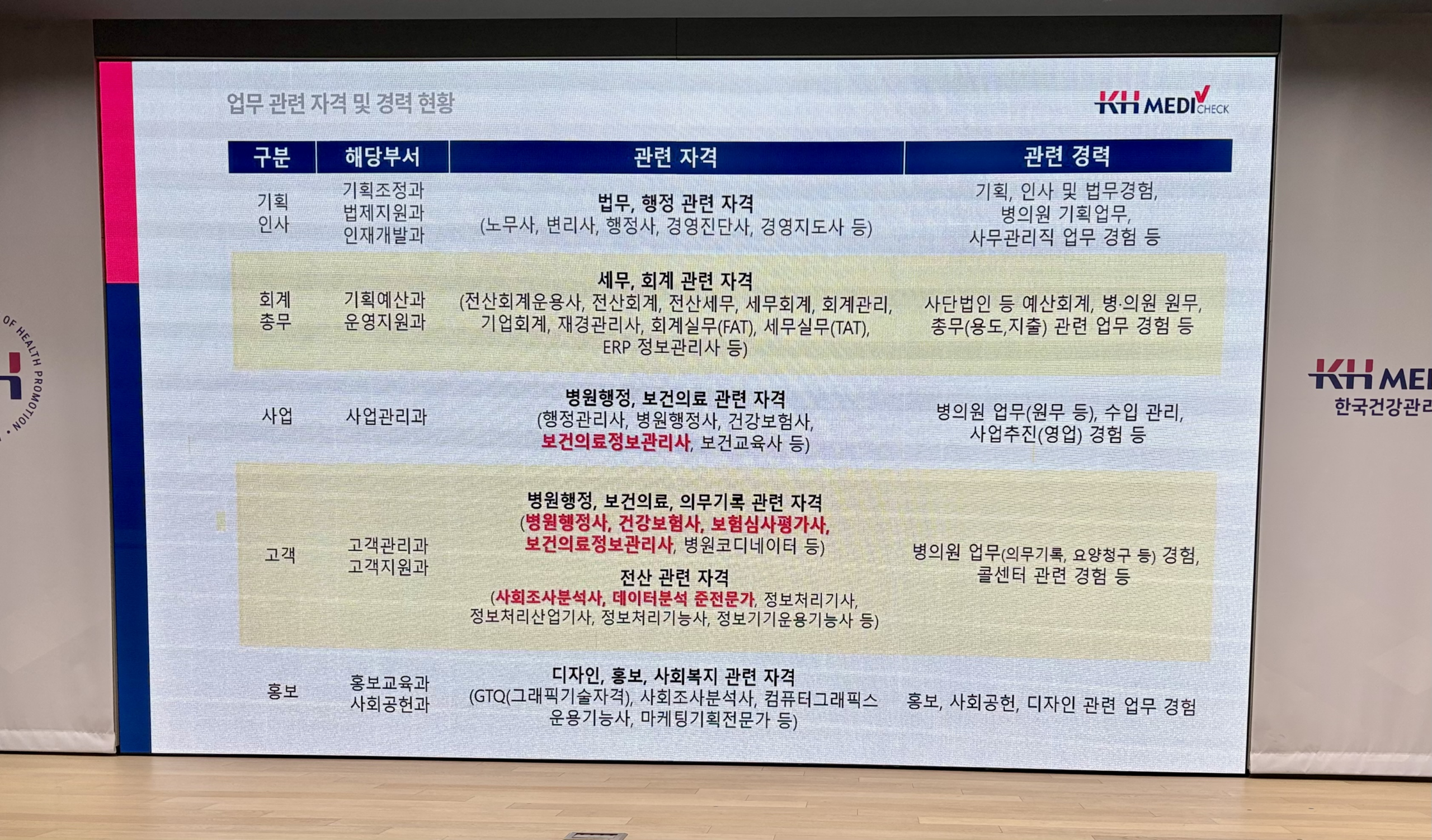 우대 자격증으로는 보건교육사, 병원행정사, 사회조사분석사 등이 도움이 된다는 설명을 들을 수 있었습니다.
