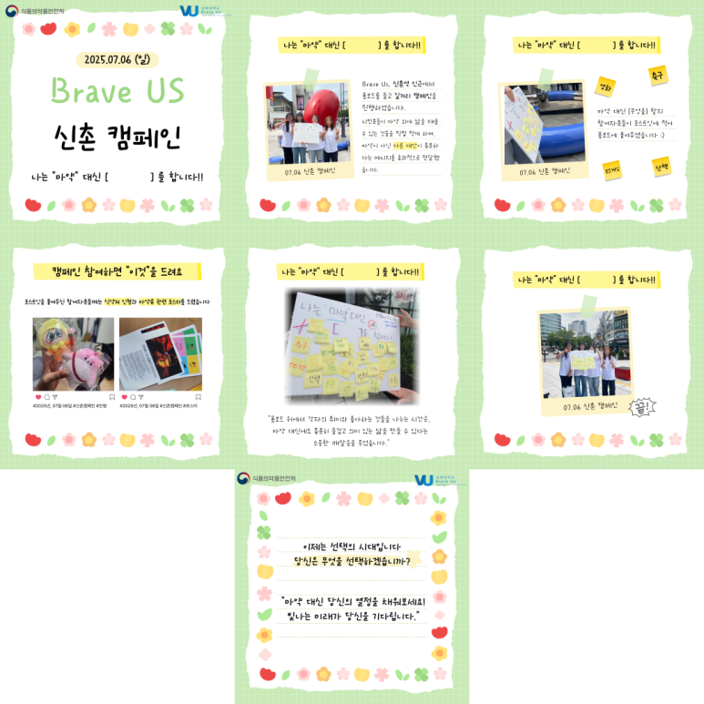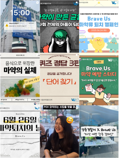 “마약? 어렵고 무서운 이야기 같다고요? 그래서 저희가 직접 공부해봤어요!”라는 저희 활동 마무리 릴스의 멘트처럼, 전공 지식은 현장에 적용될 때 비로소 힘을 발휘합니다. 여러분도 용기를 가지고 사회적 가치를 실현하는 활동에 도전해 보세요. Brave Us가 여러분의 시작을 응원하겠습니다!