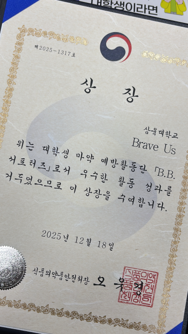[수상] 마약류 예방 서포터즈(Be Brave) 최우수상[식품의약품안전처장상] 수상 – ‘Brave Us’ 팀을 만나다.
