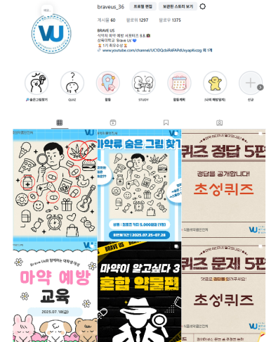“마약? 어렵고 무서운 이야기 같다고요? 그래서 저희가 직접 공부해봤어요!”라는 저희 활동 마무리 릴스의 멘트처럼, 전공 지식은 현장에 적용될 때 비로소 힘을 발휘합니다. 여러분도 용기를 가지고 사회적 가치를 실현하는 활동에 도전해 보세요. Brave Us가 여러분의 시작을 응원하겠습니다!