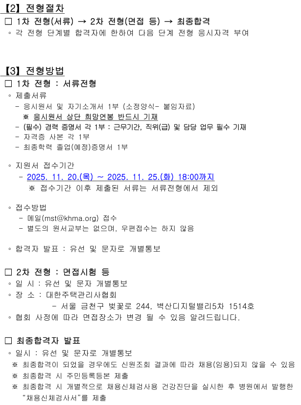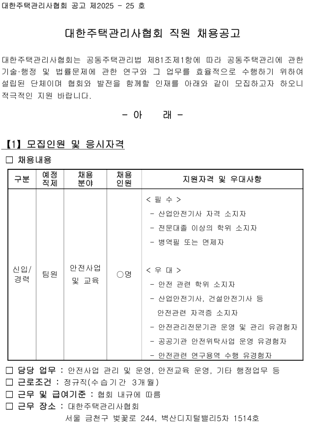 채용 PRINT [채용 공고] 대한주택관리사협회 직원 채용공고(안전문화교육팀 팀원) 2025.11.20 조회수 5 학과사무실 share facebook twitter kakaotalk 카카오톡 앱이설치된 모바일 기기에서만공유 가능합니다. https://www.syu.ac.kr/syuhealth/%ec%b1%84%ec%9a%a9-%ea%b3%b5%ea%b3%a0-%eb%8c%80%ed%95%9c%ec%a3%bc%ed%83%9d%ea%b4%80%eb%a6%ac%ec%82%ac%ed%98%91%ed%9a%8c-%ec%a7%81%ec%9b%90-%ec%b1%84%ec%9a%a9%ea%b3%b5%ea%b3%a0%ec%95%88%ec%a0%84/ 복사 2525 대한주택관리사협회 직원 채용 공고문 붙임자료.응시원서_자기소개서25 facebook twitter kakaotalk 카카오톡 앱이설치된 모바일 기기에서만공유 가능합니다. 이전글 글이 없습니다. 다음글 [채용 공고] 한국마약퇴치운동본부 2025년도 제3차 채용 공고 목록 담당부서 보건관리학과 사무실 전화번호 02-3399-1673 이메일 health@syu.ac.kr 최종수정일 : 2025.11.20