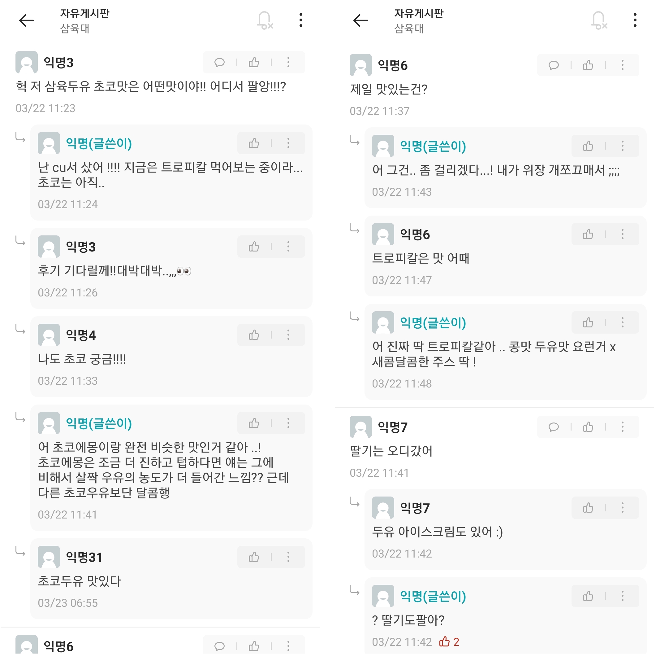 댓글 반응은 무척 뜨거웠다. 익명의 두유(삼육대 재학생 애칭)들은 판매처를 묻거나, 사진에 없는 다른 두유 제품을 추천하는가 하면, 자세한 맛을 공유하기도 했다.